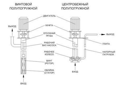 Роль рабочего органа может играть вихревое или центробежное колесо, поршень или эксцентриковый винт. В зависимости от этого, принцип работы насоса может быть, как динамическим, так и объемным. Подобное разнообразие дает возможность использовать полупогружной насос при работе с различными видами жидкости. При этом способности насоса будут определены используемым в его конструкции рабочим органом.